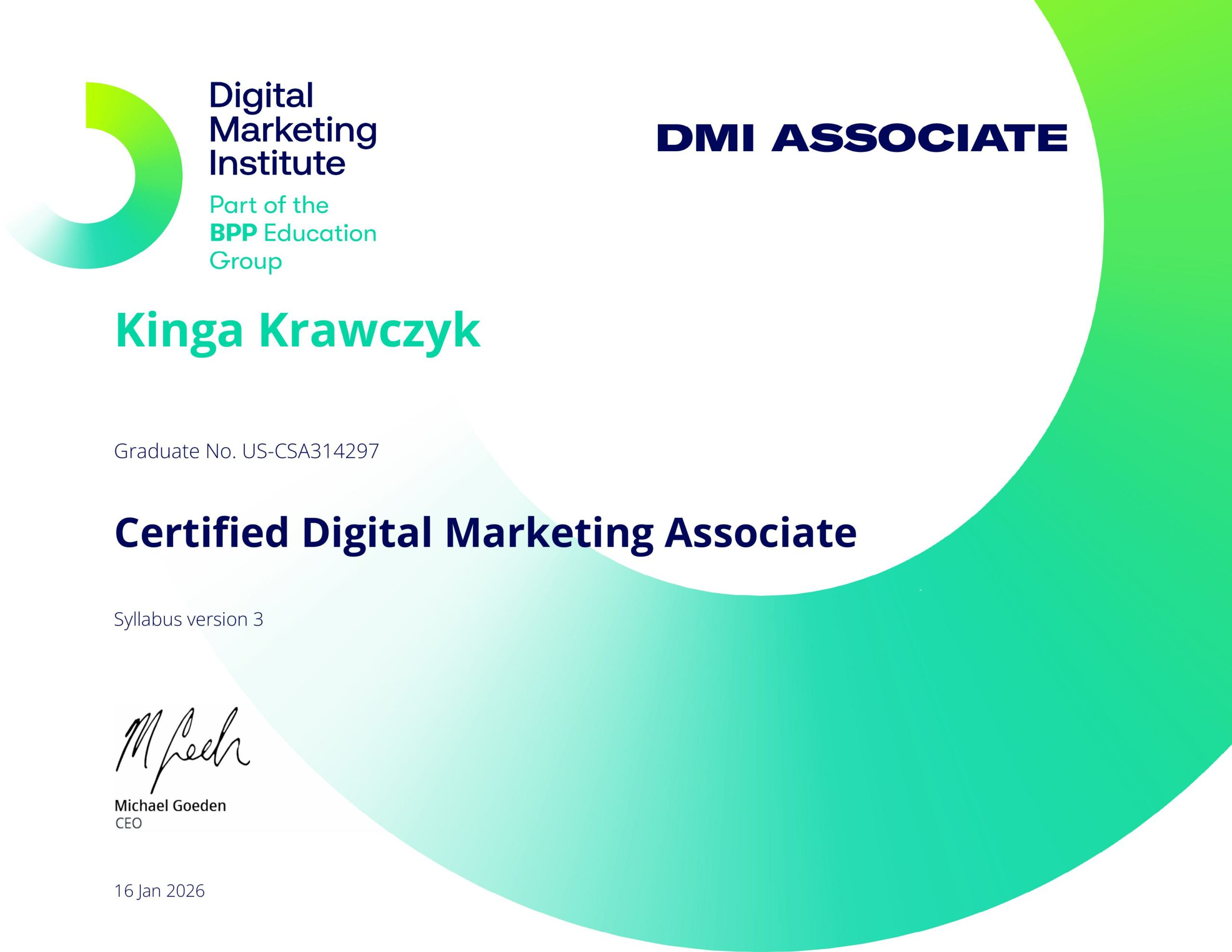 Mam Certyfikat DIMAQ Professional oraz certyfikację Google Digital Marketing & E-commerce.